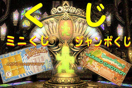 | これにくじの参加者に応じて7段階のボーナスが加算されます (ボーナスの効果や対象は毎回異なり、ワールドによっても異なります) ボーナスの進捗具合はジャンボくじテンダーに聞くか、 くじ広場のサボテンダーのオブジェクトでも知ることが出来ます。 |